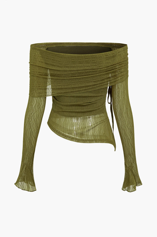 Green Vintage Texture Off Shoulder Asymmetrical Tie Mesh Top