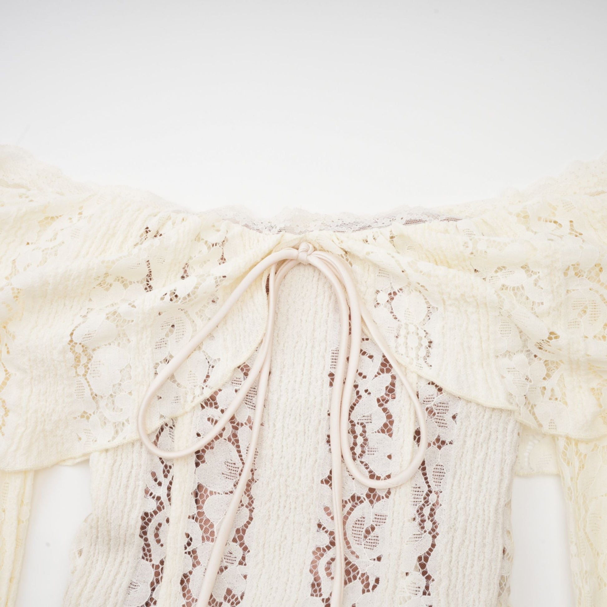 Make a timeless statement in this off-shoulder lace maxi dress, where soft neutrals meet intricate detailing. The combination of floral lace and cut-out accents creates a refined look with a modern twist, designed to highlight your silhouette.