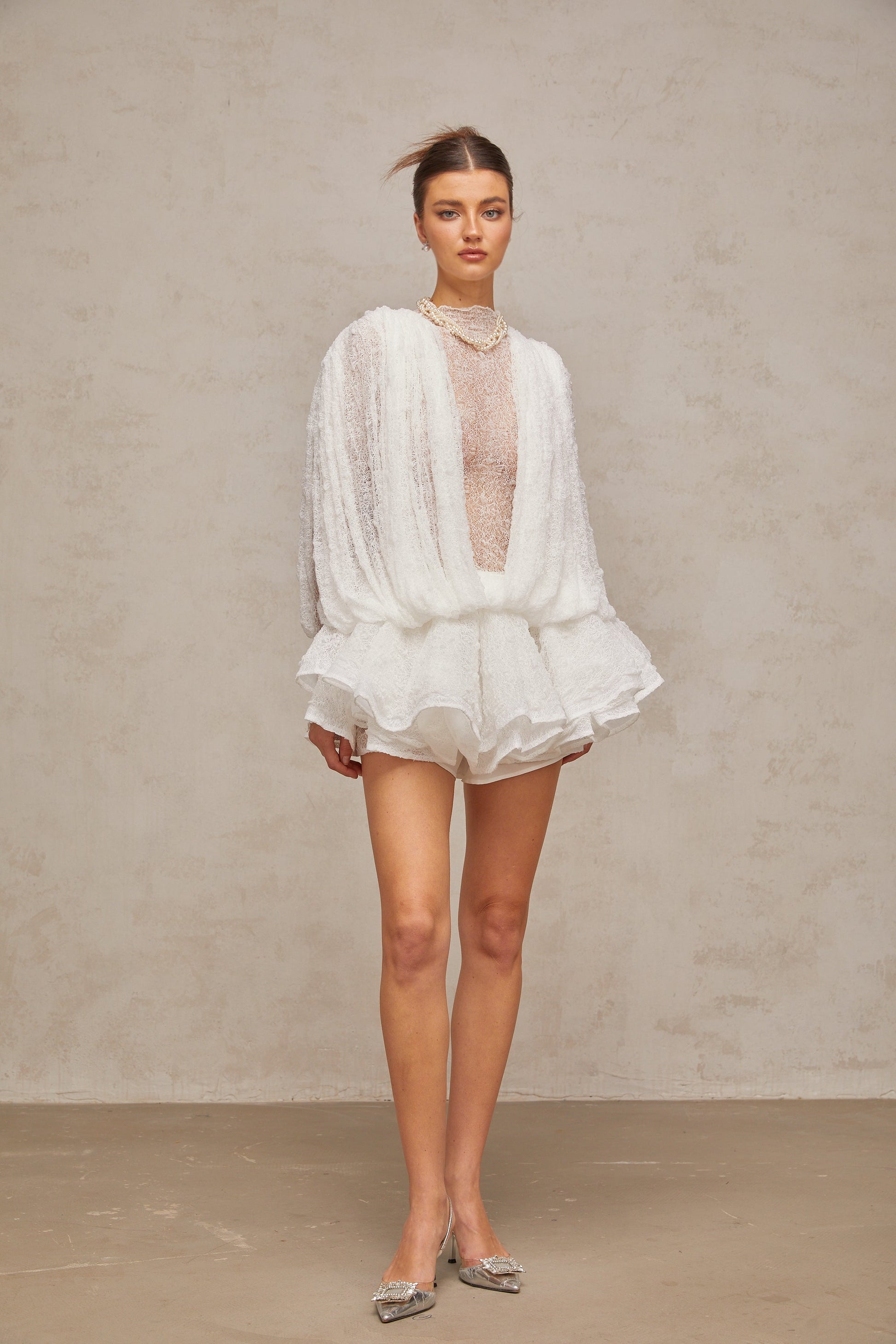 Ivory White Lace Mini Dress with Draped Detail for Women - Michela