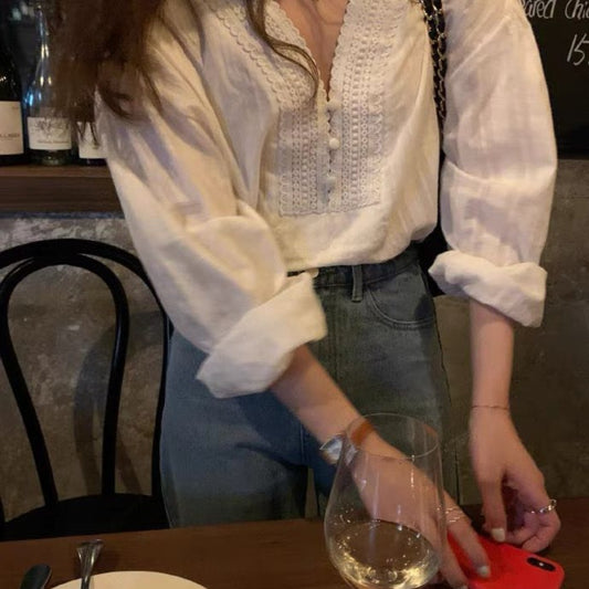 White Long Sleeve V Neck Blouse for Women - Marina