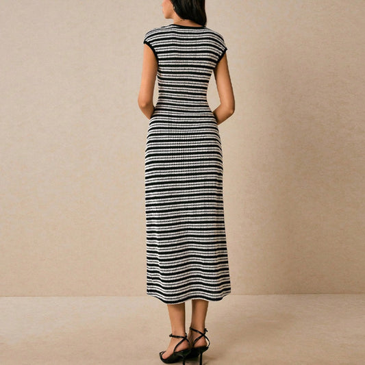 Black White Striped Midi Dress with Cap Sleeves for Women - Alba