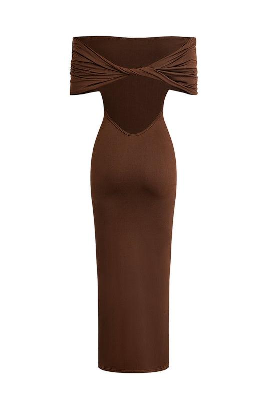 Brown Twisted Backless Off Shoulder Maxi Dress