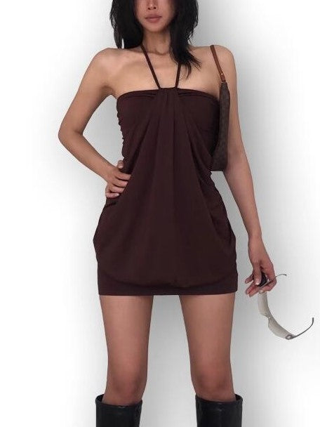 Brown Strapless Ruffle Mini Dress with Strappy Design