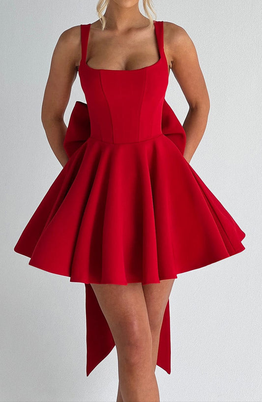 Cherry Red Mini Dress with Back Bow Detail for Women - Irene