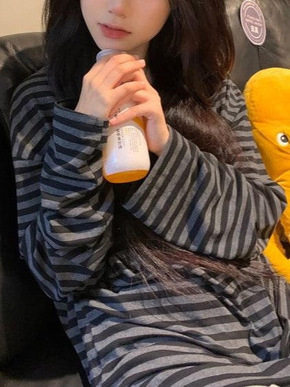 Black Vintage Striped Round Neck Long Sleeve Top