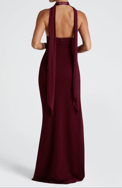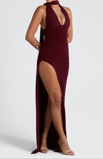 Bold & Sultry Design: The Paulina Maxi Dress in Cherry Lacquer is a striking statement piece, featuring a daring plunge halter neckline that ties elegantly at the back.