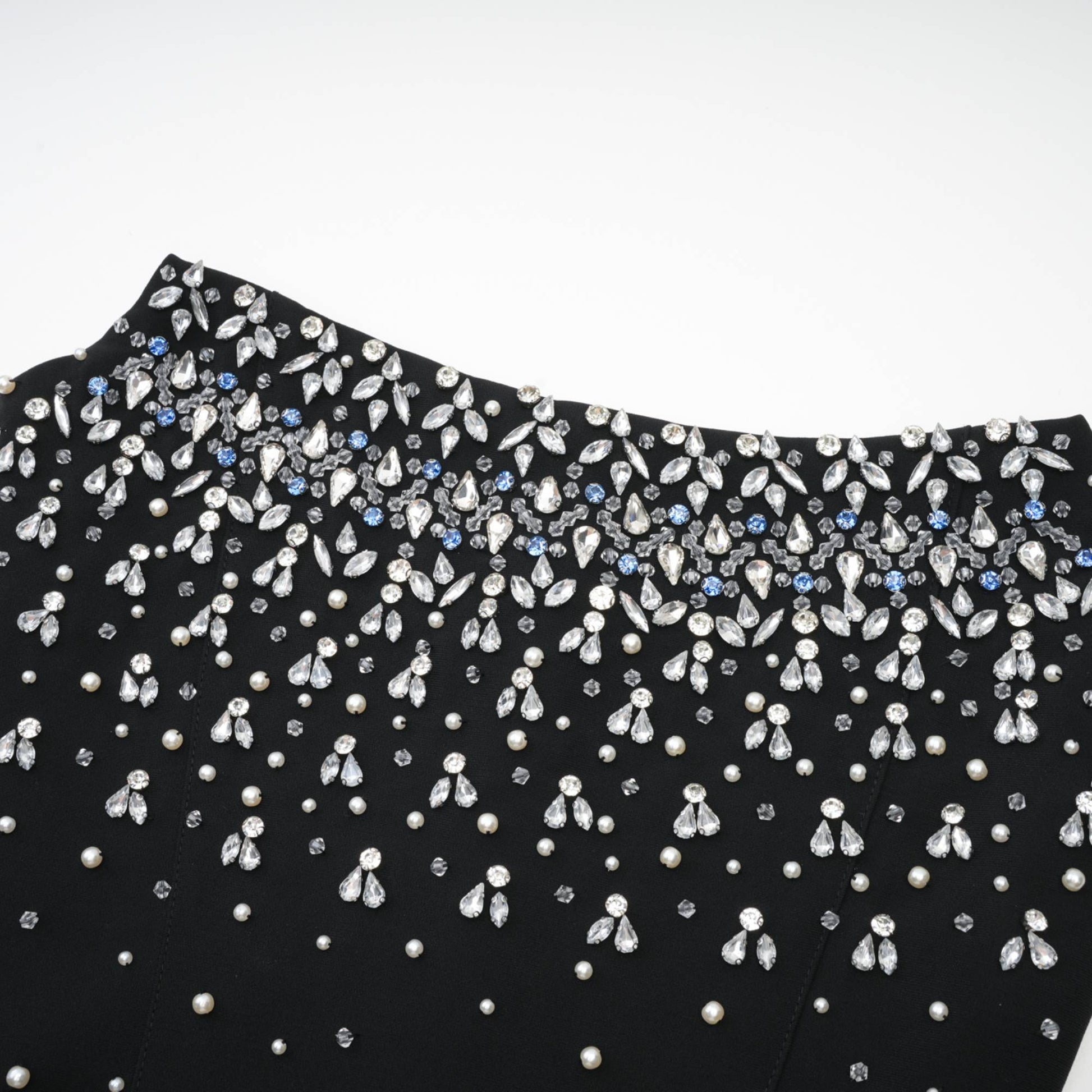 This strapless mini dress is a statement piece, fully embellished with pearls and crystals that add sophisticated sparkle to any look. Featuring an off-the-shoulder design and sleeveless style, it combines elegance with modern flair, creating the perfect balance for any wardrobe.