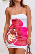 Strapless mini dress with a vibrant orchid placement print, offering a chic and playful aesthetic.