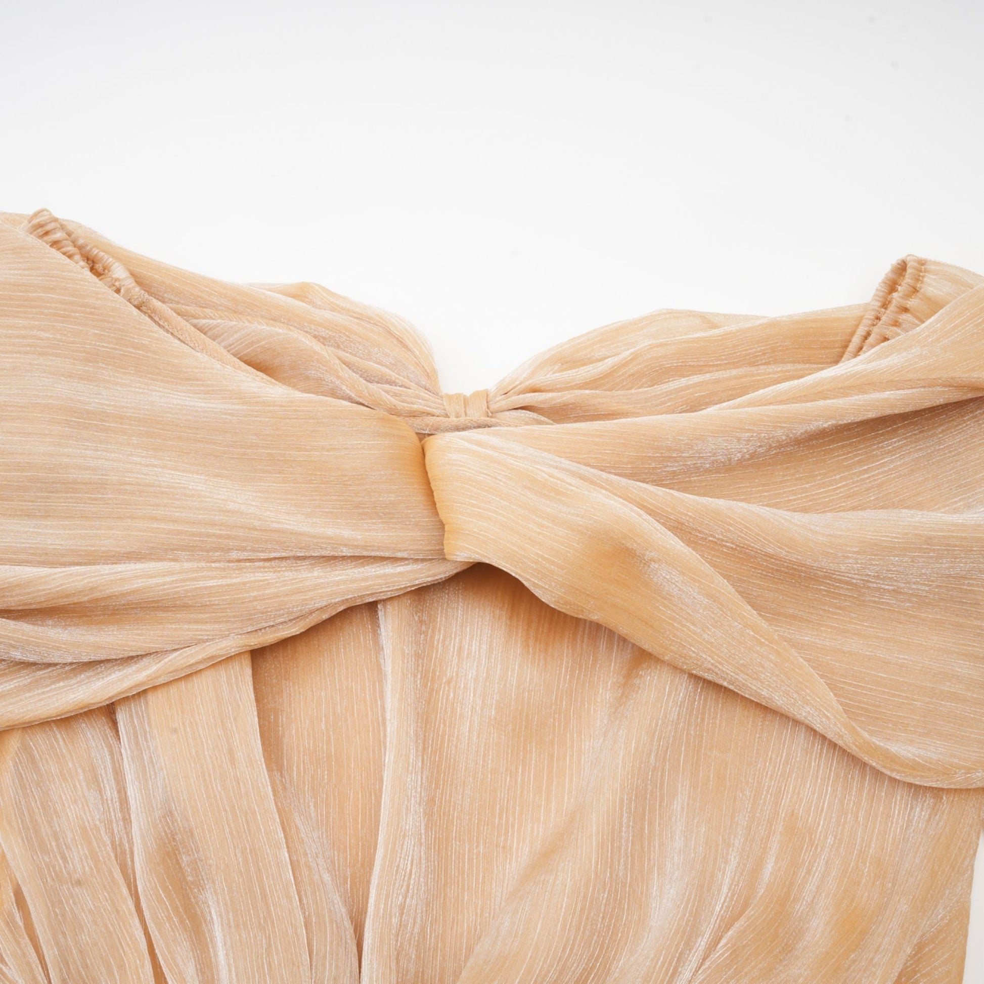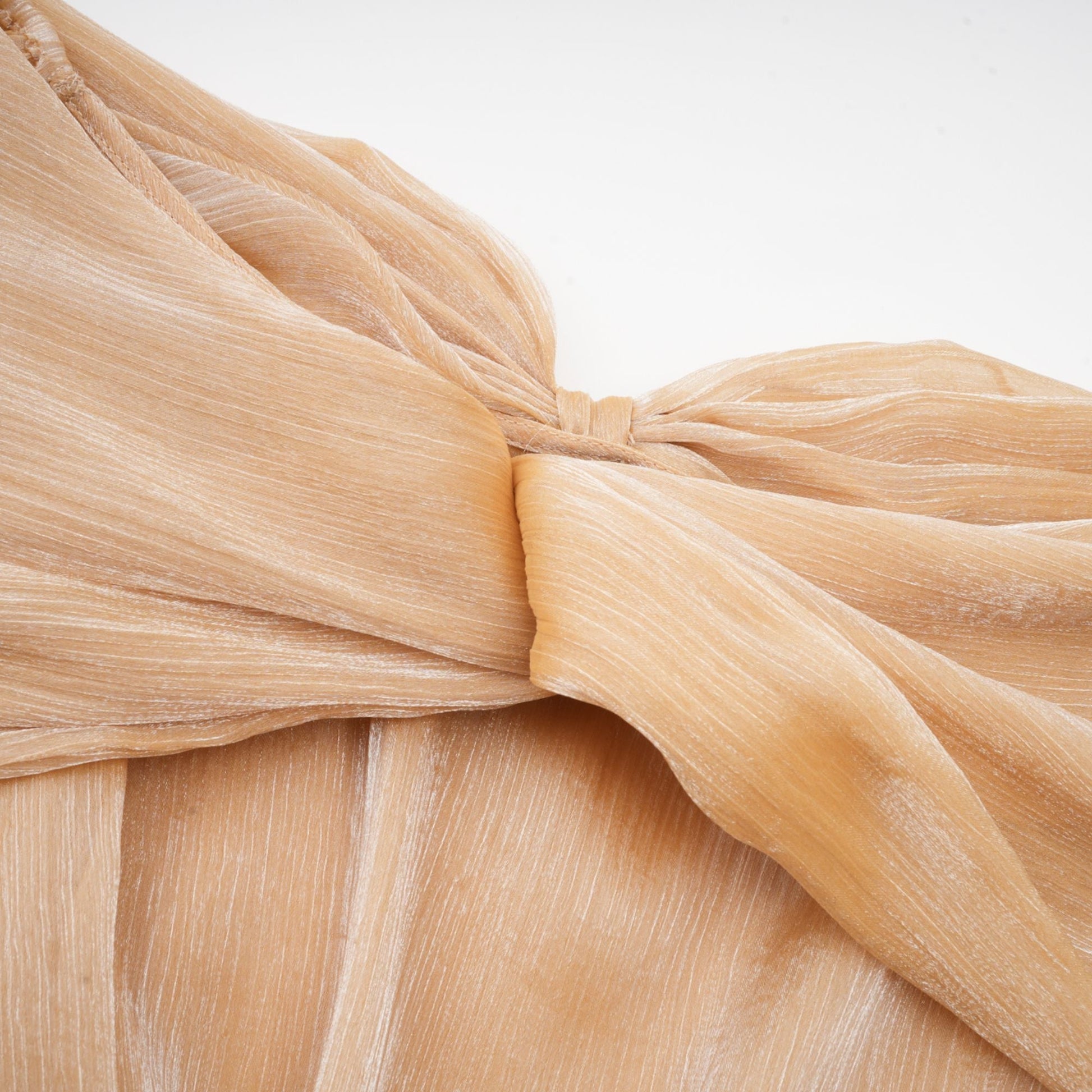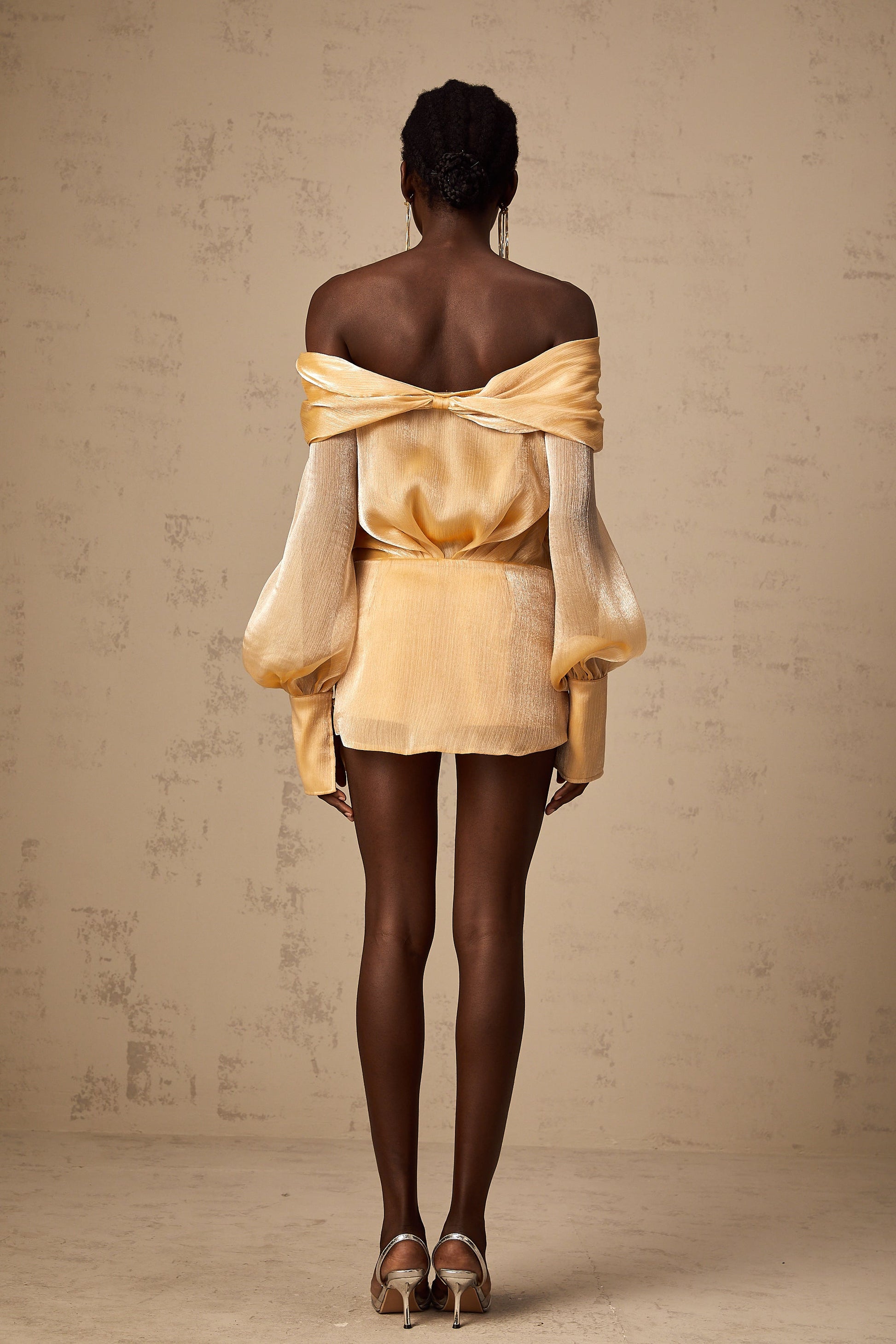 This gold-tone dress offers a luxurious and stylish appearance with its elegant off-shoulder design and crystal embellishments. Featuring dramatic long puff sleeves and a figure-flattering panelled design, this piece is perfect for making a chic statement.