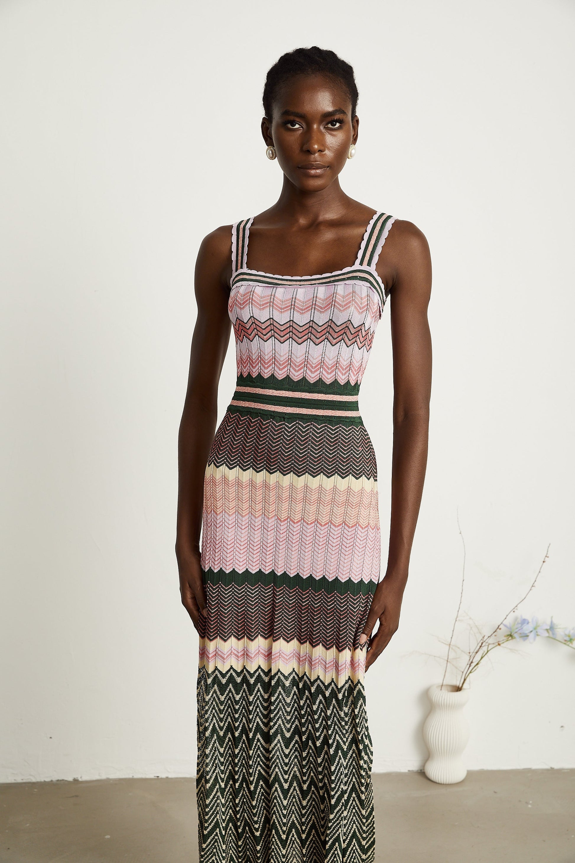 Multi-Color Knit Maxi Dress with Chevron Pattern for Women - Sabrina