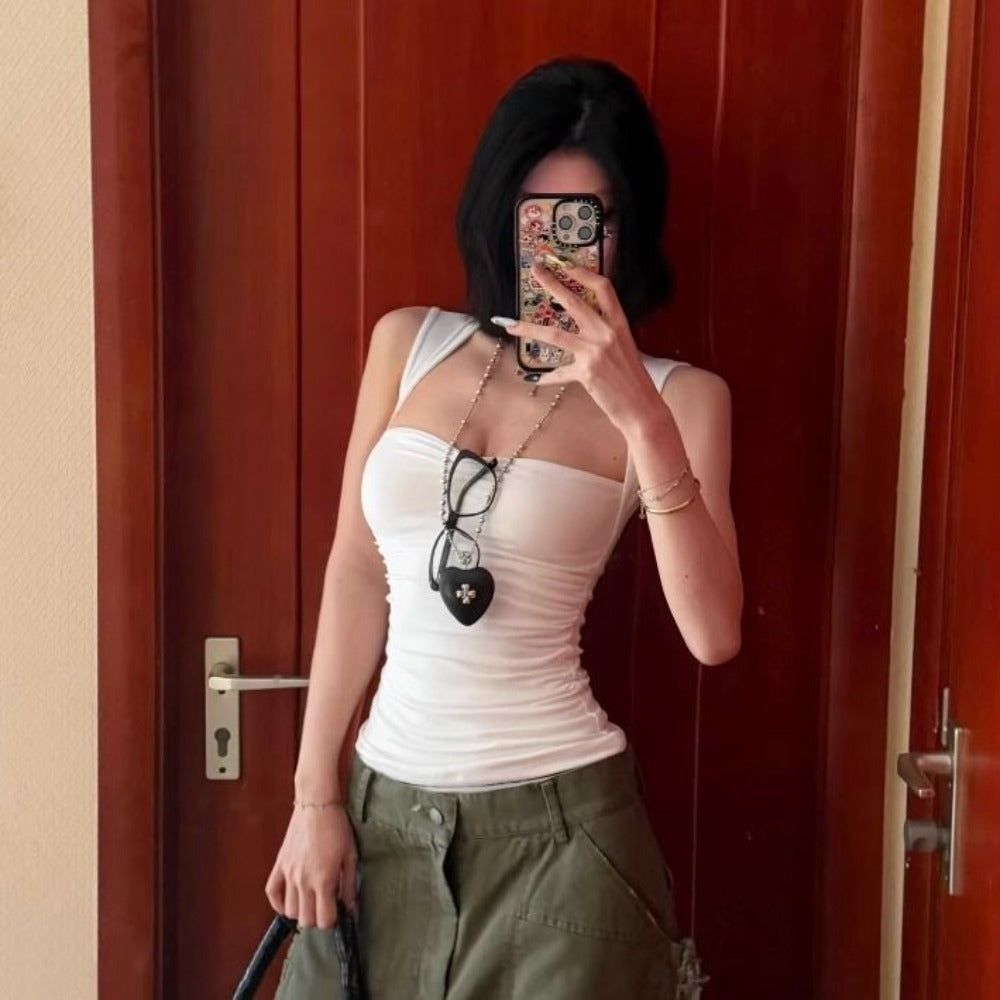 Upgrade your everyday basics with this white sleeveless fitted tank top designed for a clean and versatile look. Its flattering cut and comfortable fabric make it an essential piece to wear on its own or layered under jackets and shirts.