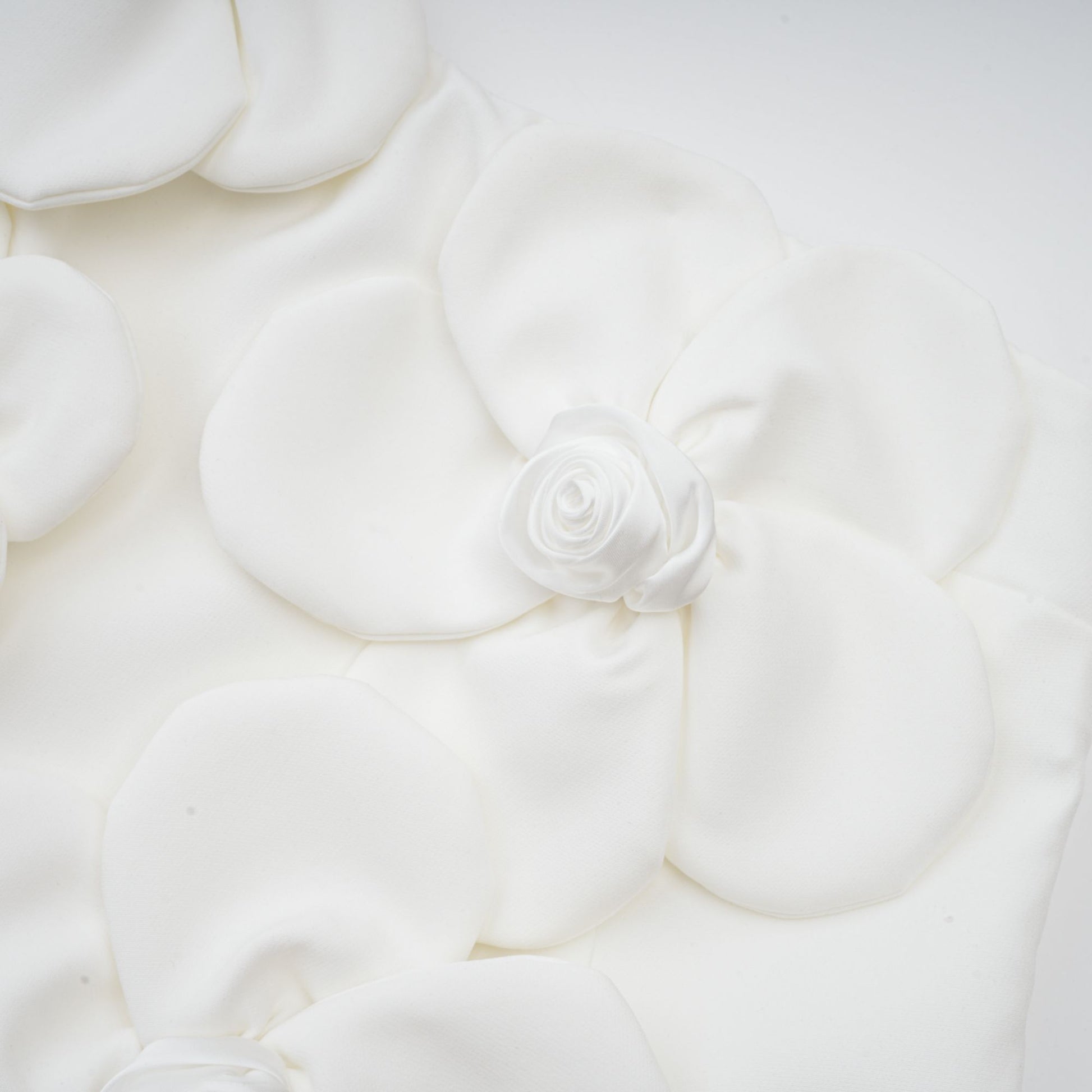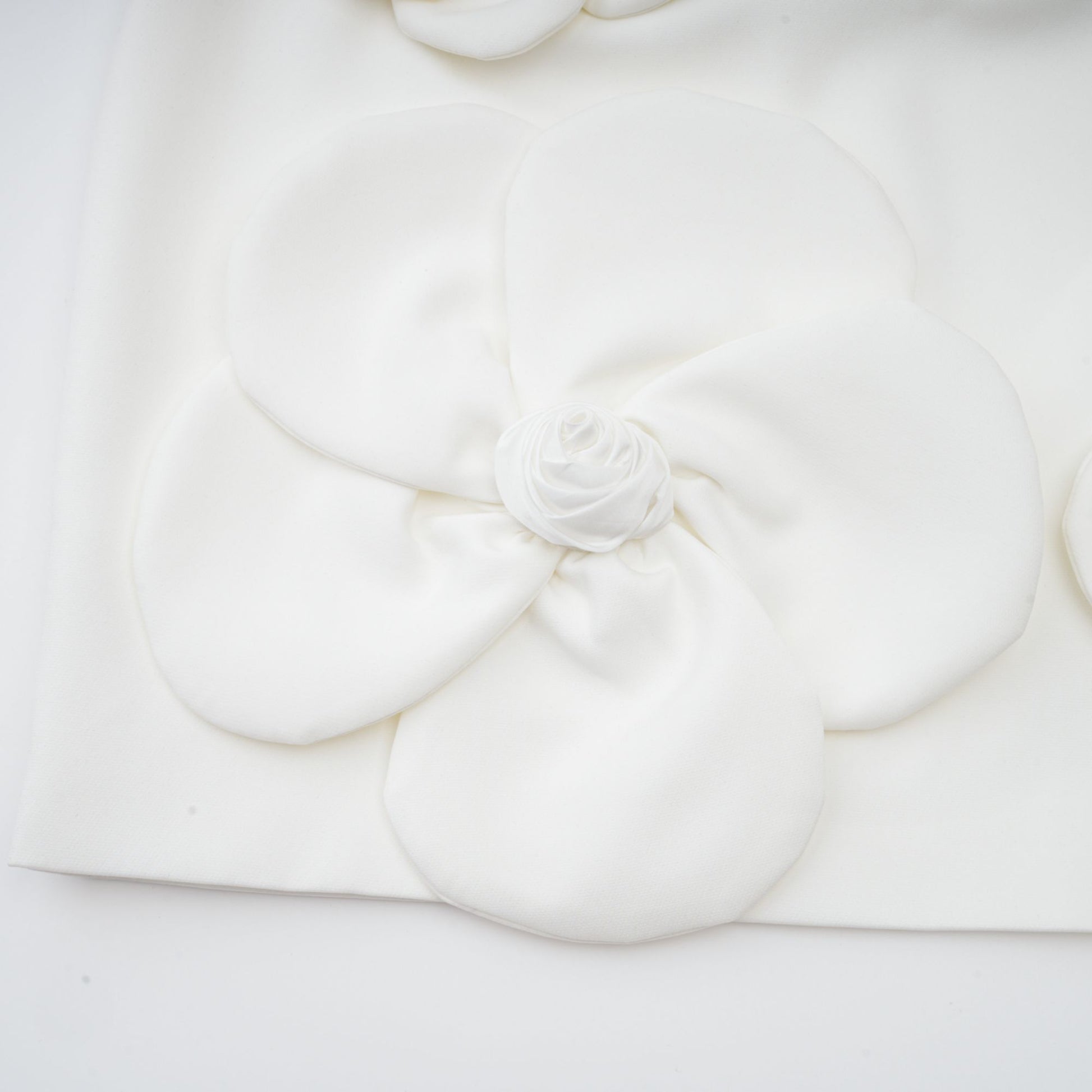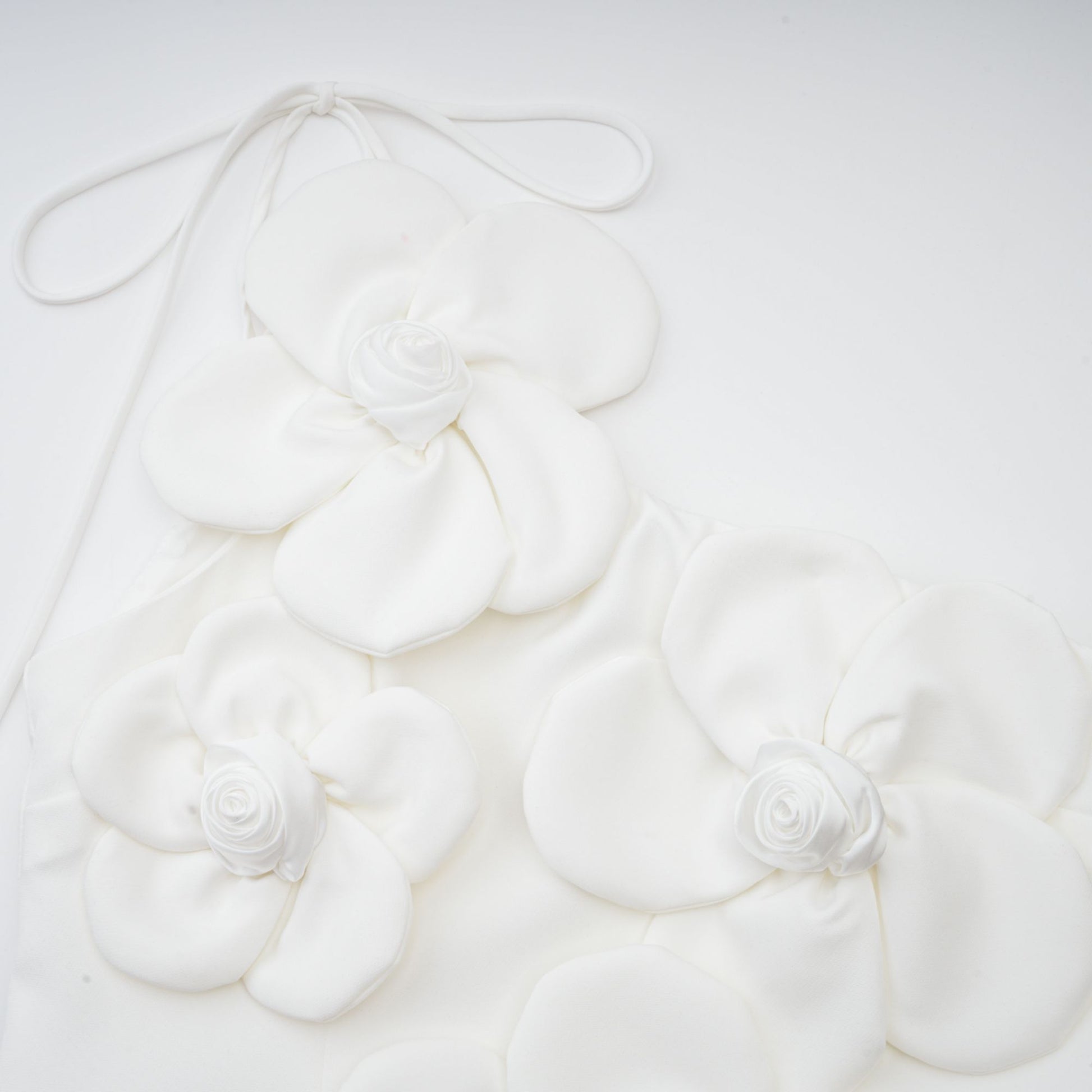 Make a bold statement with this asymmetrical mini dress, designed to turn heads with its sculptural floral appliqués and modern silhouette. Crafted in a crisp white tone, this piece offers a fresh take on contemporary design with artful detailing and flattering structure.