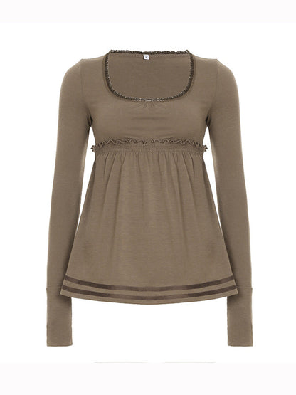 Brown Vintage Square Collar Stitching Long Sleeve Tee