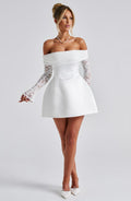 Romantic Vintage-Inspired Dress - Meet Georgianna, a dreamy ivory mini dress featuring a signature bubble-shaped skirt and cinched waist for a flattering silhouette. The premium non-stretch satin bodice contrasts beautifully with delicate floral lace sleeves, creating an elegant balance of structure and femininity.
