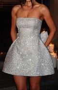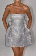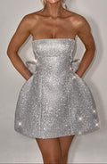 Steal the spotlight in this silver sparkly mini dress, designed for bold entrances and unforgettable nights. With its sculpted bodice, voluminous bubble skirt, and oversized bow detail, this strapless style brings full feminine drama to your party look.