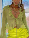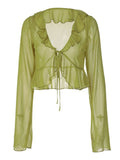 Green Sheer Mesh Long Sleeve Crop Blouse with Ruffle