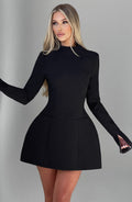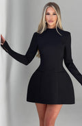 Chic and Sophisticated Mini Dress: The Kelly mini dress is your go-to piece for the new season, designed to elevate your wardrobe with its premium non-stretch crepe fabric. Featuring a high darted neckline and long sleeves, this dress combines elegance with modern details for a polished look.