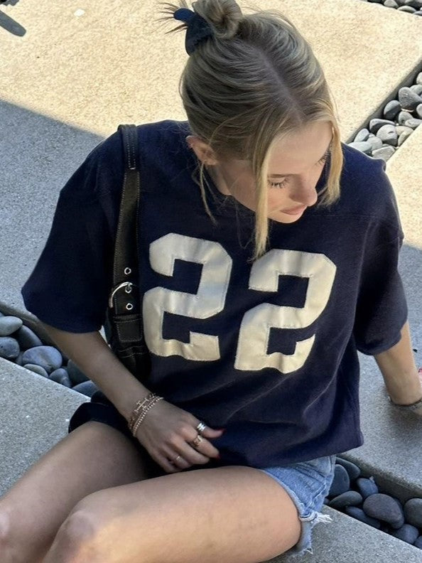 Navy Blue Vintage Digital Print Short Sleeve Top