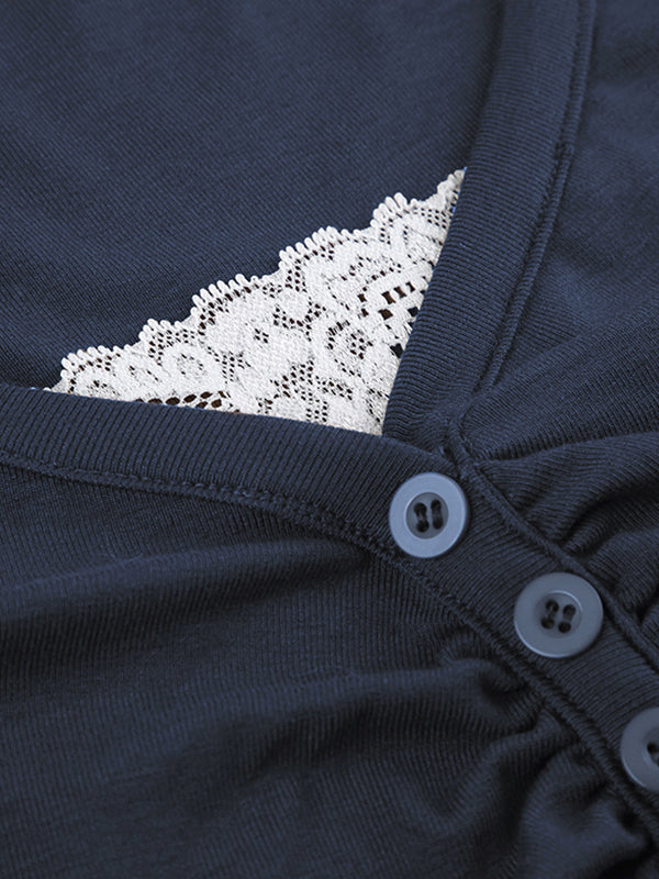 Navy Blue Vintage Lace Splice Ruched Breasted Long Sleeve Tee