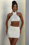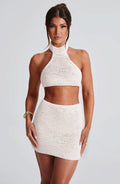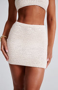 Boho-Chic Knit Set – The Margot mini skirt is perfect for free spirits and sun-seekers, crafted from premium chunky hand-knit fabric in a warm ivory hue. Designed for effortless style, it pairs perfectly with the matching Margot top for a coordinated boho look.