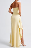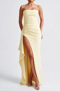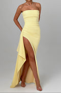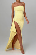 Make an unforgettable entrance in this strapless lemon maxi dress – designed to sculpt your shape and command attention at any formal occasion. With pleated details, a dramatic side drape, and a thigh-high split, this dress strikes the perfect balance between elegance and allure.