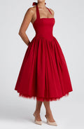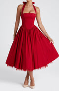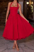 Bold and Elegant Design: The Cressida Midi Dress in vibrant red is a show-stopping piece designed to turn heads at any special occasion. Featuring a square halter neckline and princess seams, this dress combines sophistication with a modern, flattering silhouette.