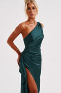 Elegant One-Shoulder Style – Featuring a chic one-shoulder design and draped detailing, this dress combines sophistication and modern elegance for a standout look.
