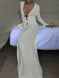 Description: Make a statement in this boho chic crochet maxi beach dress. It hugs your curves in all the right places, featuring a plunging neckline, split cuffs, and a Chinese knot button closure at the front. Perfect for parties, holidays, dates, and beach outings.